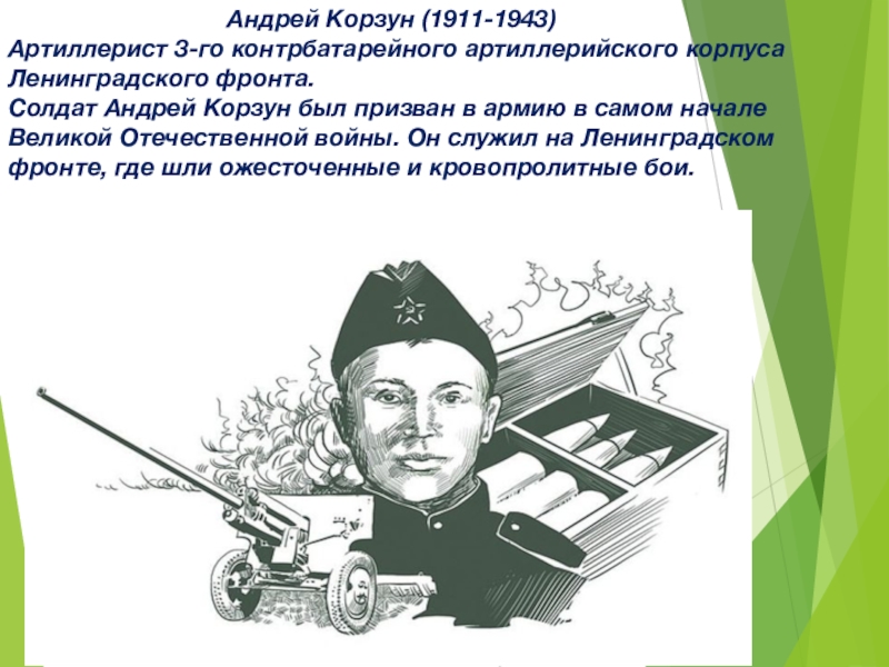 Солдат Андрей Корзун был призван в армию в самом начале Великой Отечественной войны. Он служил на Ленинградском фронте, где шли ожесточенные и кровопролитные бои.
