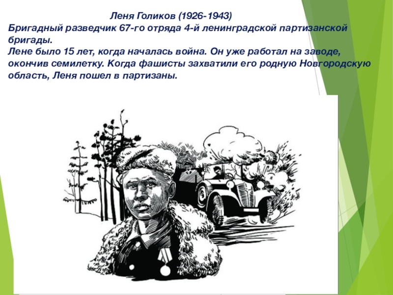 Лене было 15 лет, когда началась война. Он уже работал на заводе, окончив семилетку. Когда фашисты захватили его родную Новгородскую область, Леня пошел в партизаны.