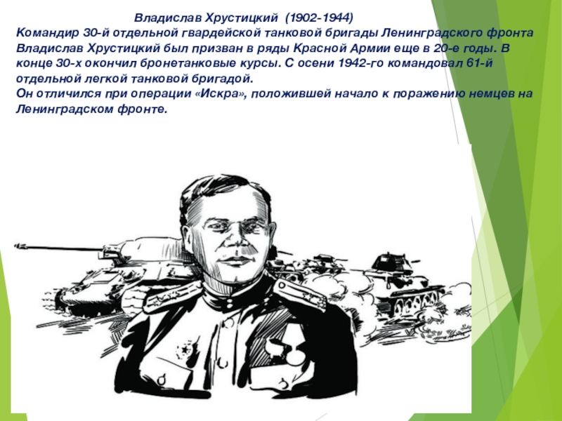 Владислав Хрустицкий был призван в ряды Красной Армии еще в 20-е годы. В конце 30-х окончил бронетанковые курсы. С осени 1942-го командовал 61-й отдельной легкой танковой бригадой.
