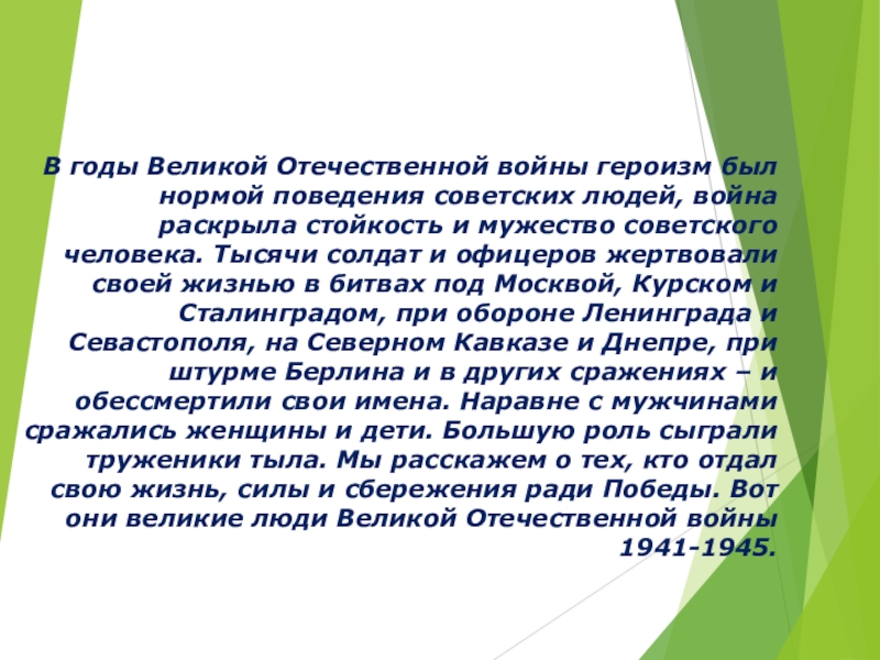 война раскрыла стойкость и мужество советского человека. Тысячи солдат и офицеров жертвовали своей жизнью в битвах под Москвой, Курском и Сталинградом, при обороне Ленинграда и Севастополя, на Северном Кавказе и Днепре, при штурме Берлина и в других сражениях – и обессмертили свои имена. Наравне с мужчинами сражались женщины и дети. Большую роль сыграли труженики тыла. Мы расскажем о тех, кто отдал свою жизнь, силы и сбережения ради Победы. Вот они великие люди Великой Отечественной войны 1941-1945.