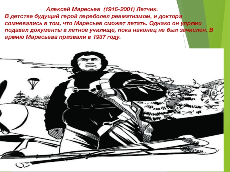 В детстве будущий герой переболел ревматизмом, и доктора сомневались в том, что Маресьев сможет летать. Однако он упрямо подавал документы в летное училище, пока наконец не был зачислен. В армию Маресьева призвали в 1937 году.