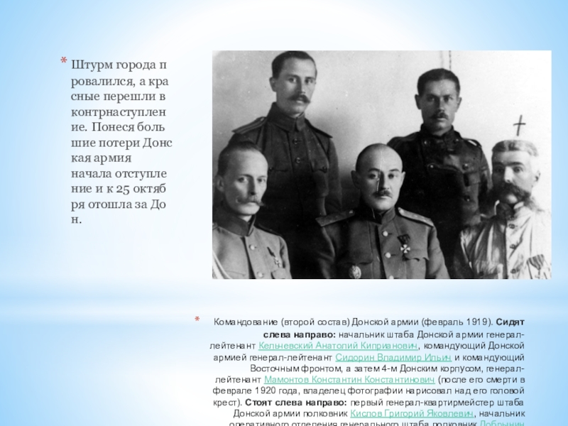 армии генерал-лейтенант Кельчевский Анатолий Киприанович, командующий Донской армией генерал-лейтенант Сидорин Владимир Ильич и командующий Восточным фронтом, а затем 4-м Донским корпусом, генерал-лейтенант Мамонтов Константин Константинович (после его смерти в феврале 1920 года, владелец фотографии нарисовал над его головой крест). Стоят слева направо: первый генерал-квартирмейстер штаба Донской армии полковник Кислов Григорий Яковлевич, начальник оперативного отделения генерального штаба полковник Добрынин Владимир Васильевич