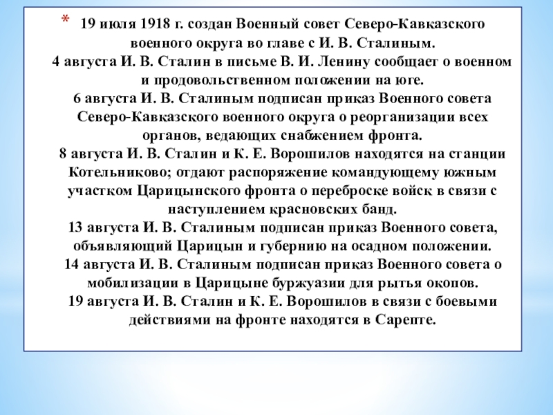 13 августа И. В. Сталиным подписан приказ Военного совета, объявляющий Царицын и губернию на осадном положении.