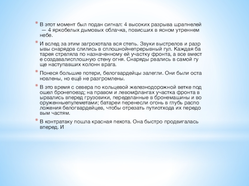 Слайд 21В этот момент был подан сигнал: 4 высоких разрыва шрапнелей — 4 яркобелых дымовых облачка, повисших в ясном утреннем небе.