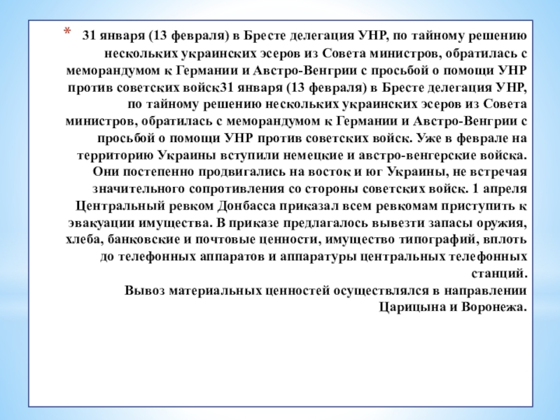 нескольких украинских эсеров из Совета министров, обратилась с меморандумом к Германии и Австро-Венгрии с просьбой о помощи УНР против советских войск31 января (13 февраля) в Бресте делегация УНР, по тайному решению нескольких украинских эсеров из Совета министров, обратилась с меморандумом к Германии и Австро-Венгрии с просьбой о помощи УНР против советских войск. Уже в феврале на территорию Украины вступили немецкие и австро-венгерские войска. Они постепенно продвигались на восток и юг Украины, не встречая значительного сопротивления со стороны советских войск. 1 апреля Центральный ревком Донбасса приказал всем ревкомам приступить к эвакуации имущества. В приказе предлагалось вывезти запасы оружия, хлеба, банковские и почтовые ценности, имущество типографий, вплоть до телефонных аппаратов и аппаратуры центральных телефонных станций.