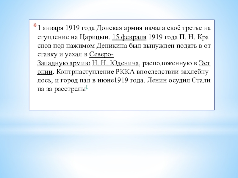 Слайд 241 января 1919 года Донская армия начала своё третье наступление на Царицын. 15 февраля 1919 года П. Н. Краснов под нажимом Деникина был вынужден подать в отставку и уехал в Северо-Западную армию Н. Н. Юденича, расположенную в Эстонии. Контрнаступление РККА впоследствии захлебнулось, и город пал в июне1919 года. Ленин осудил Сталина за расстрелы[