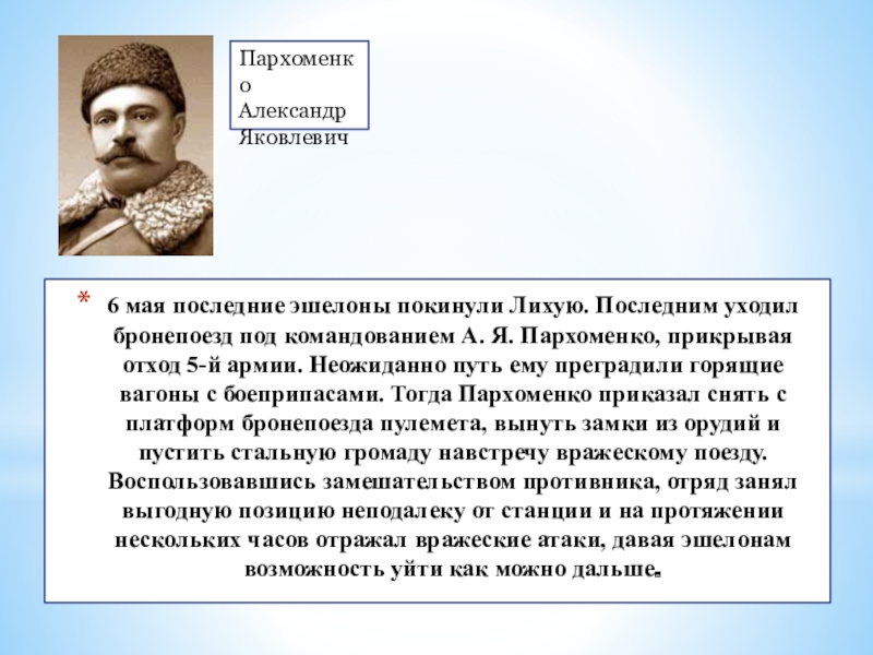Слайд 96 мая последние эшелоны покинули Лихую. Последним уходил бронепоезд под командованием