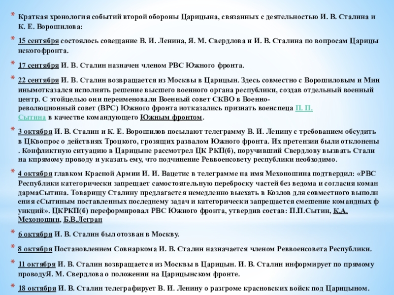 Слайд 23Краткая хронология событий второй обороны Царицына, связанных с деятельностью И. В. Сталина и К. Е. Ворошилова: