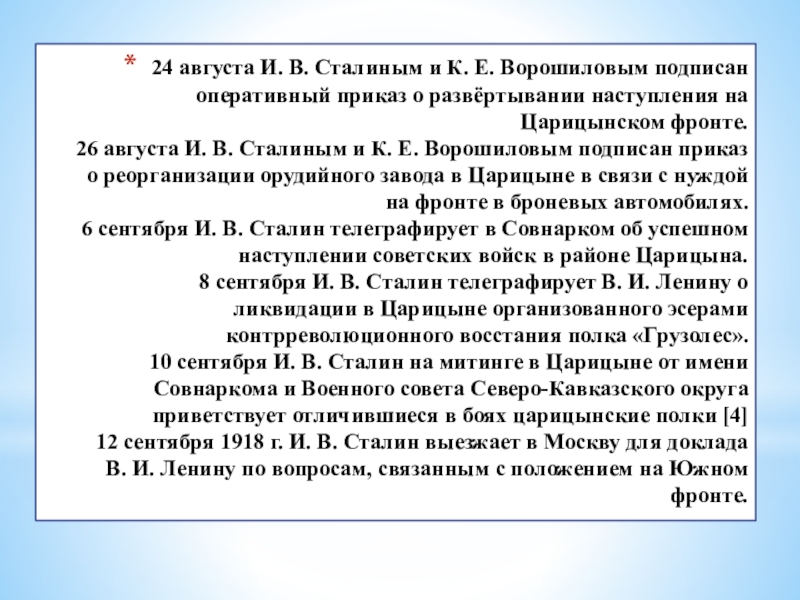 10 сентября И. В. Сталин на митинге в Царицыне от имени Совнаркома и Военного совета Северо-Кавказского округа приветствует отличившиеся в боях царицынские полки [4]