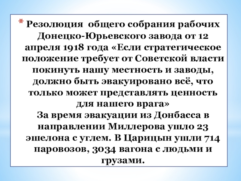 Слайд 6Резолюция общего собрания рабочих Донецко-Юрьевского завода от 12 апреля 1918 года