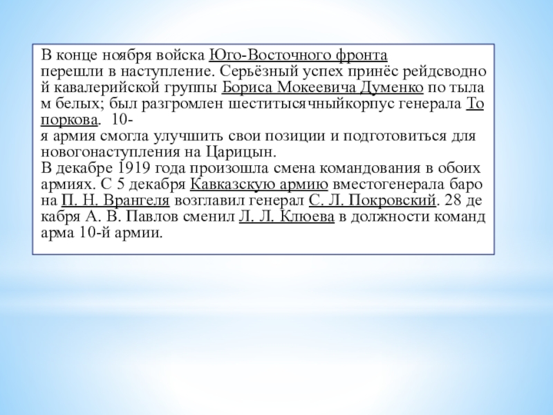 Слайд 28В конце ноября войска Юго-Восточного фронта перешли в наступление. Серьёзный успех принёс рейдсводной кавалерийской группы Бориса Мокеевича Думенко по тылам белых; был разгромлен шеститысячныйкорпус генерала Топоркова. 10-я армия смогла улучшить свои позиции и подготовиться для новогонаступления на Царицын. В декабре 1919 года произошла смена командования в обоих армиях. С 5 декабря Кавказскую армию вместогенерала барона П. Н. Врангеля возглавил генерал С. Л. Покровский. 28 декабря А. В. Павлов сменил Л. Л. Клюева в должности командарма 10-й армии.