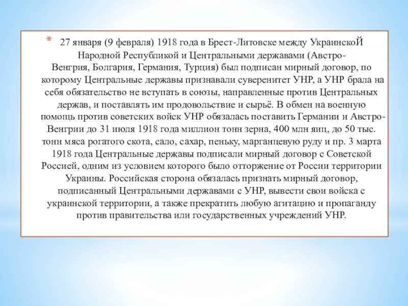 Слайд 427 января (9 февраля) 1918 года в Брест-Литовске между УкраинскоЙ Народной Республикой и Центральными державами (Австро-Венгрия, Болгария, Германия, Турция) был подписан мирный договор, по