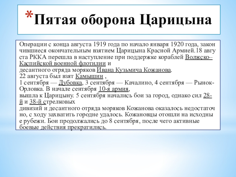 Операции с конца августа 1919 года по начало января 1920 года, закончившиеся окончательным взятием Царицына Красной Армией.18 августа РККА перешла в наступление при поддержке кораблей Волжско–Каспийской военной флотилии и десантного отряда моряков Ивана Кузьмича Кожанова. 22 августа был взят Камышин , 1 сентября — Дубовка, 3 сентября — Качалино, 4 сентября — Рынок-Орловка. В начале сентября 10-я армия, вышла к Царицыну. 5 сентября начались бои за город, однако сил 28-й и 38-й стрелковых дивизий и десантного отряда моряков Кожанова оказалось недостаточно, с ходу захватить городне удалось. Кожановцы отошли на исходные рубежи. Бои продолжались до 8 сентября, после чего активные боевые действия прекратились.