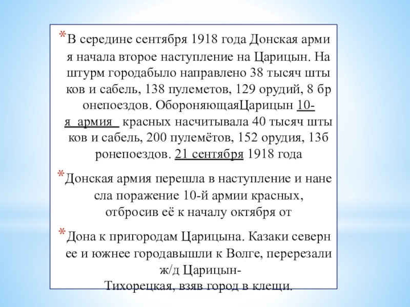 Слайд 17В середине сентября 1918 года Донская армия начала второе наступление на Царицын. На штурм городабыло направлено 38 тысяч штыков и сабель, 138 пулеметов, 129 орудий, 8 бронепоездов. ОбороняющаяЦарицын 10-я армия красных насчитывала 40 тысяч штыков и сабель, 200 пулемётов, 152 орудия, 13бронепоездов. 21 сентября 1918 года