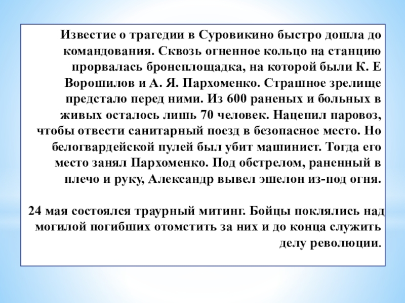 Слайд 11Известие о трагедии в Суровикино быстро дошла до командования. Сквозь огненное