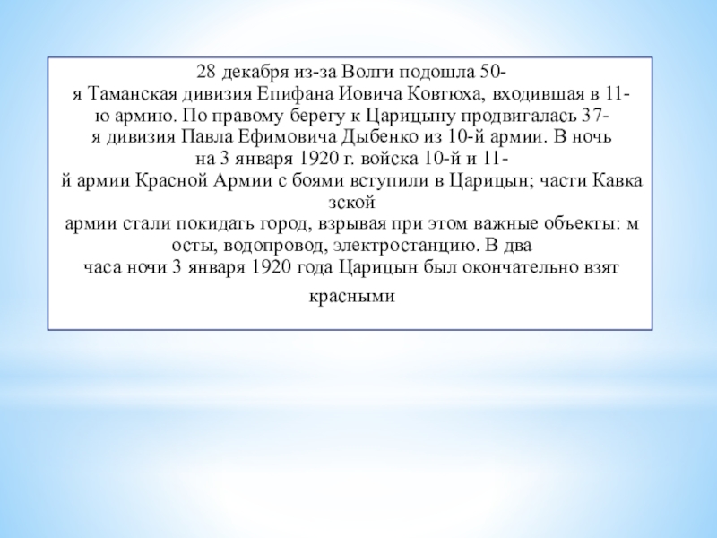 Слайд 2928 декабря из-за Волги подошла 50-я Таманская дивизия Епифана Иовича Ковтюха, входившая в 11-ю армию. По правому берегу к Царицыну продвигалась 37-я дивизия Павла Ефимовича Дыбенко из 10-й армии. В ночь на 3 января 1920 г. войска 10-й и 11-й армии Красной Армии с боями вступили в Царицын; части Кавказской армии стали покидать город, взрывая при этом важные объекты: мосты, водопровод, электростанцию. В два часа ночи 3 января 1920 года Царицын был окончательно взят