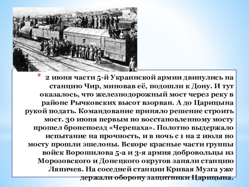её, подошли к Дону. И тут оказалось, что железнодорожный мост через реку в районе Рычковских высот взорван. А до Царицына рукой подать. Командование приняло решение строить мост. 30 июня первым по восстановленному мосту прошел бронепоезд «Черепаха». Полотно выдержало испытание на прочность, и в ночь с 1 на 2 июля по мосту прошли эшелоны. Вскоре красные части группы войск Ворошилова 5-а и 3-я армия добровольцы из Морозовского и Донецкого округов заняли станцию Ляпичев. На соседней станции Кривая Музга уже держали оборону защитники Царицына.