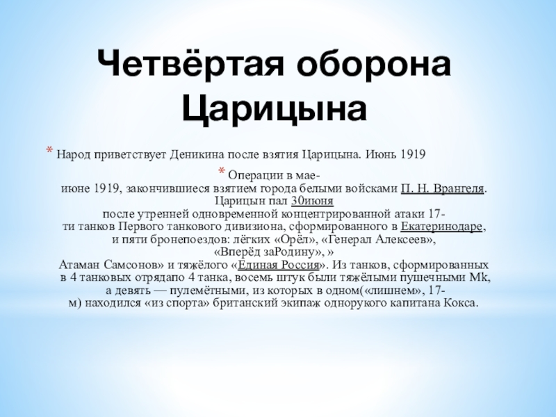 Операции в мае-июне 1919, закончившиеся взятием города белыми войсками П. Н. Врангеля. Царицын пал 30июня после утренней одновременной концентрированной атаки 17-ти танков Первого танкового дивизиона, сформированного в Екатеринодаре, и пяти бронепоездов: лёгких «Орёл», «Генерал Алексеев», «Вперёд заРодину», »Атаман Самсонов» и тяжёлого «Единая Россия». Из танков, сформированных в 4 танковых отрядапо 4 танка, восемь штук были тяжёлыми пушечными Mk, а девять — пулемётными, из которых в одном(«лишнем», 17-м) находился «из спорта» британский экипаж однорукого капитана Кокса.