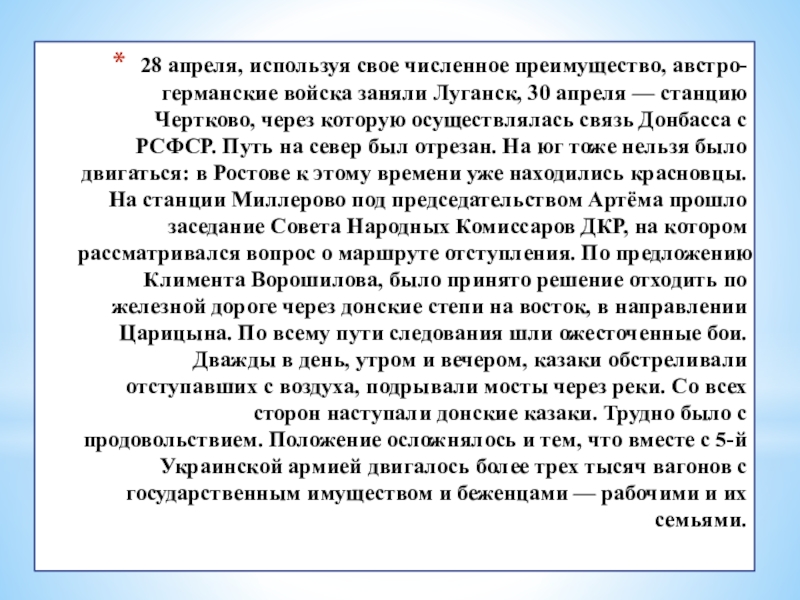 апреля — станцию Чертково, через которую осуществлялась связь Донбасса с РСФСР. Путь на север был отрезан. На юг тоже нельзя было двигаться: в Ростове к этому времени уже находились красновцы. На станции Миллерово под председательством Артёма прошло заседание Совета Народных Комиссаров ДКР, на котором рассматривался вопрос о маршруте отступления. По предложению Климента Ворошилова, было принято решение отходить по железной дороге через донские степи на восток, в направлении Царицына. По всему пути следования шли ожесточенные бои. Дважды в день, утром и вечером, казаки обстреливали отступавших с воздуха, подрывали мосты через реки. Со всех сторон наступали донские казаки. Трудно было с продовольствием. Положение осложнялось и тем, что вместе с 5-й Украинской армией двигалось более трех тысяч вагонов с государственным имуществом и беженцами — рабочими и их семьями.