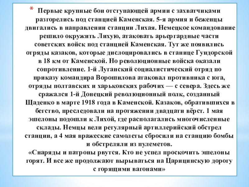 Слайд 8Первые крупные бои отступающей армии с захватчиками разгорелись под станцией Каменская.