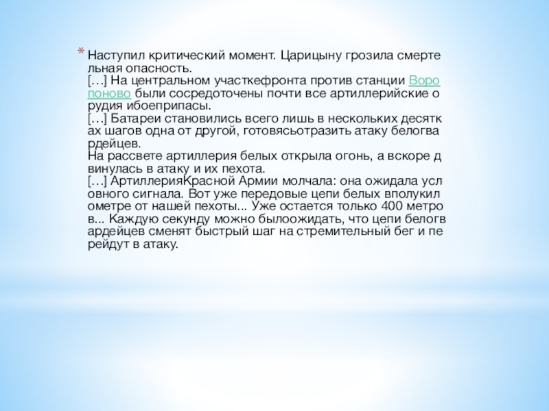 Слайд 20Наступил критический момент. Царицыну грозила смертельная опасность. […] На центральном участкефронта против станции Воропоново были сосредоточены почти все артиллерийские орудия ибоеприпасы. […] Батареи становились всего лишь в нескольких десятках шагов одна от другой, готовясьотразить атаку белогвардейцев.На рассвете артиллерия белых открыла огонь, а вскоре двинулась в атаку и их пехота. […] АртиллерияКрасной Армии молчала: она ожидала условного сигнала. Вот уже передовые цепи белых вполукилометре от нашей пехоты... Уже остается только 400 метров... Каждую секунду можно былоожидать, что цепи белогвардейцев сменят быстрый шаг на стремительный бег и перейдут в атаку.