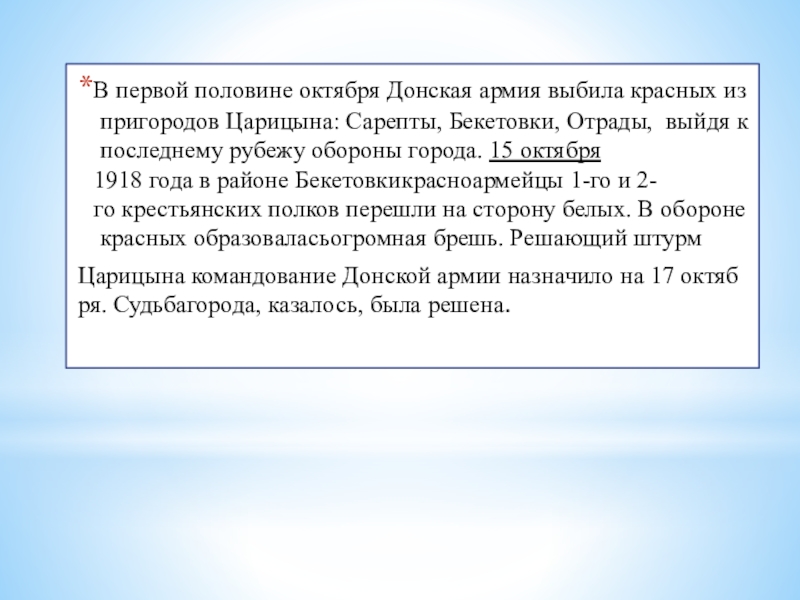 Слайд 18В первой половине октября Донская армия выбила красных из пригородов Царицына: Сарепты, Бекетовки, Отрады, выйдя к последнему рубежу обороны города. 15 октября 1918 года в районе Бекетовкикрасноармейцы 1-го и 2-го крестьянских полков перешли на сторону белых. В обороне красных образоваласьогромная брешь. Решающий штурм