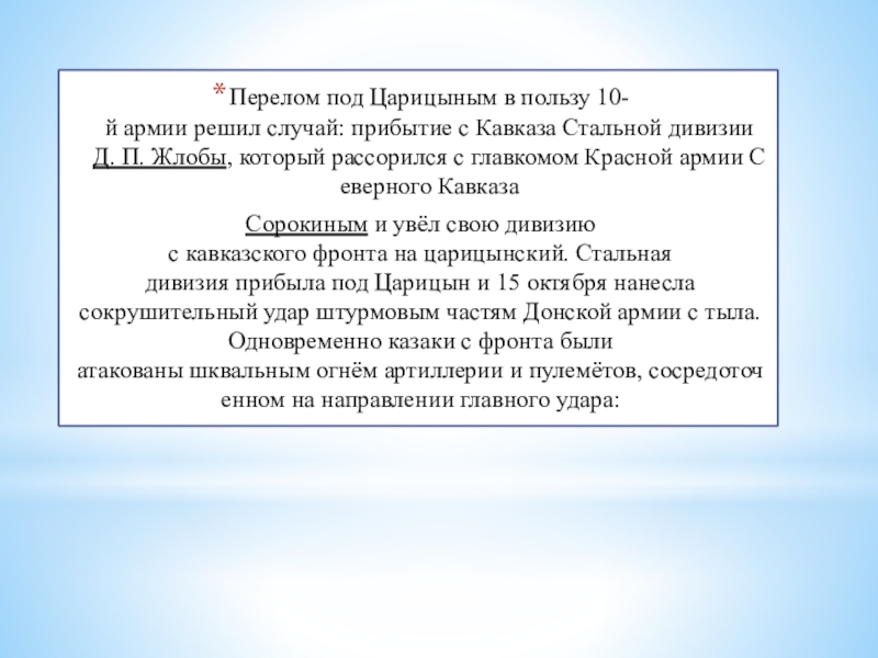 Слайд 19Перелом под Царицыным в пользу 10-й армии решил случай: прибытие с Кавказа Стальной дивизии Д. П. Жлобы, который рассорился с главкомом Красной армии Северного Кавказа