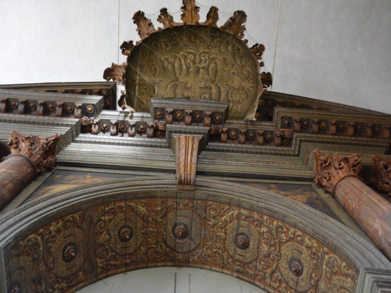 его сторон находятся двери, по бокам которых - ниши со статуями, а над ними по ложе.