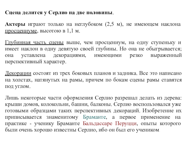 Лишь некоторые части оформления Серлио разрешал делать из дерева: крыши домов, колокольни, башни, балконы. Серлио воспользовался уже готовыми образцами таких перспективных декораций. Изобретение их приписывается знаменитому Браманте, а первое применение на практике - ученику Браманте Бальдассаре Перуцци, опыты которого были очень хорошо известны Серлио, ибо он был его учеником.