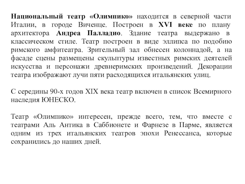Слайд 16Национальный театр «Олимпико» находится в северной части Италии, в городе Виченце.