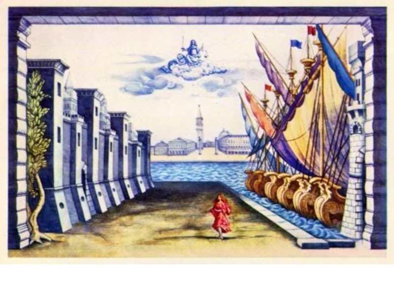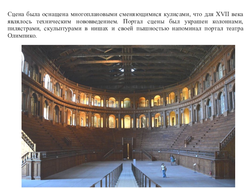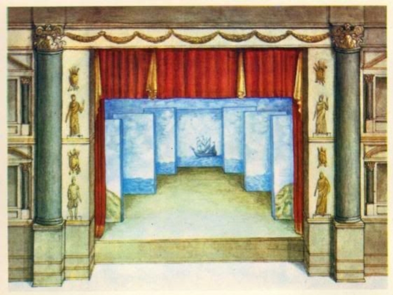 Слайд 30Сцена была оснащена многоплановыми сменяющимися кулисами, что для XVII века являлось