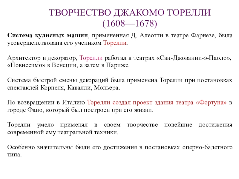 Торелли умело применял в своем творчестве новейшие достижения современной ему театральной техники.