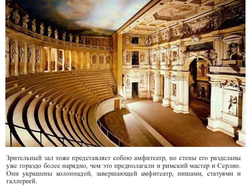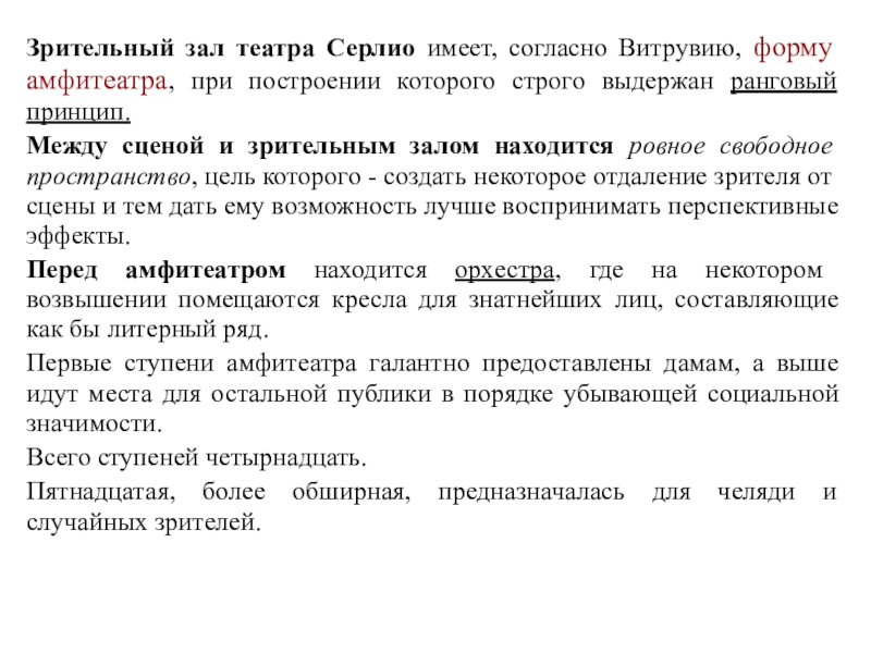 Слайд 13Зрительный зал театра Серлио имеет, согласно Витрувию, форму амфитеатра, при построении
