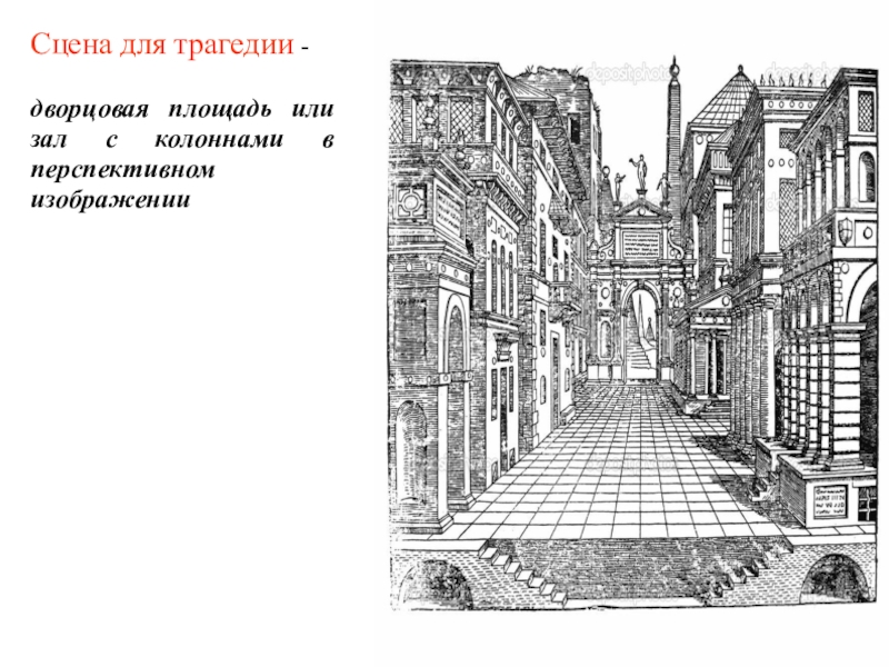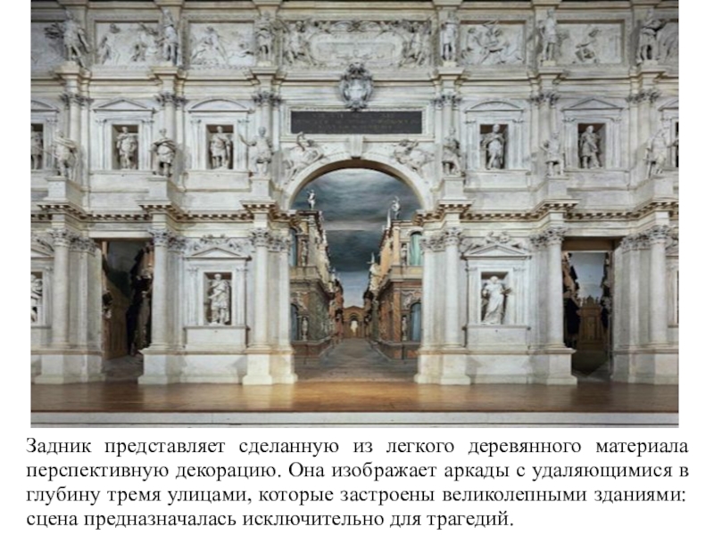 аркады с удаляющимися в глубину тремя улицами, которые застроены великолепными зданиями: сцена предназначалась исключительно для трагедий.