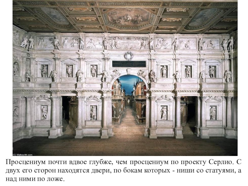 Слайд 19Просцениум почти вдвое глубже, чем просцениум по проекту Серлио. С двух