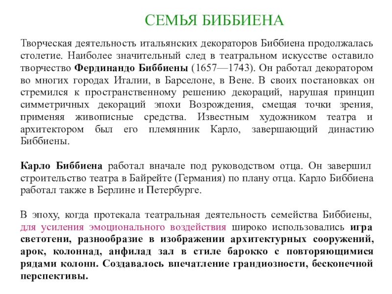 в театральном искусстве оставило творчество Фердинандо Биббиены (1657—1743). Он работал декоратором во многих городах Италии, в Барселоне, в Вене. В своих постановках он стремился к пространственному решению декораций, нарушая принцип симметричных декораций эпохи Возрождения, смещая точки зрения, применяя живописные средства. Известным художником театра и архитектором был его племянник Карло, завершающий династию Биббиены.