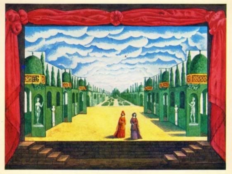 Пространство сцены оказалось богато такими декорационными возможностями, о которых раньше и не подозревали. Появилось не только живописное оформление задника, но и кулис. Задник, составляющий одно целое с боковыми декорациями и написанный согласно законам перспективы, облегчал возможность частых и быстрых перемен.