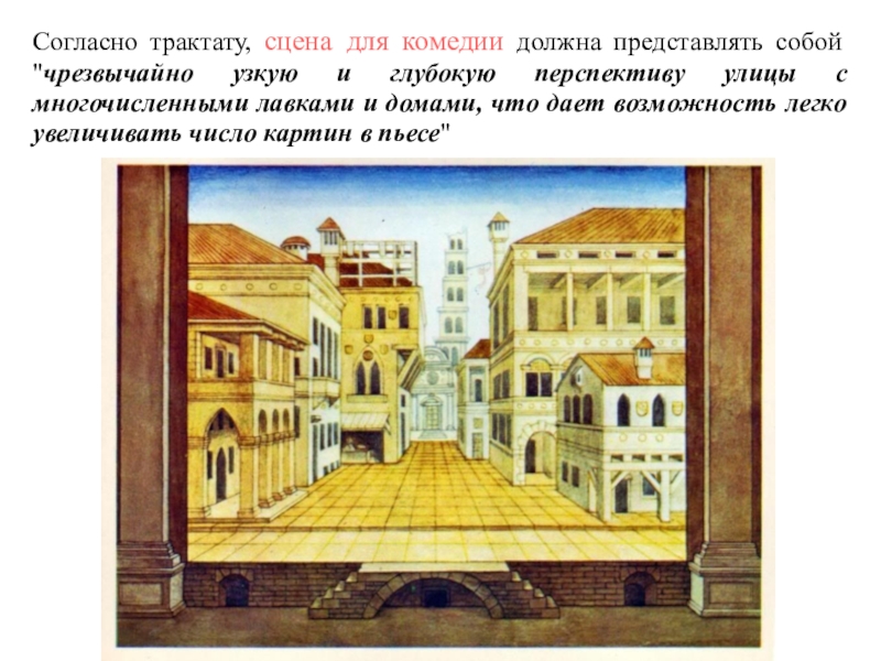 Слайд 9Согласно трактату, сцена для комедии должна представлять собой "чрезвычайно узкую и
