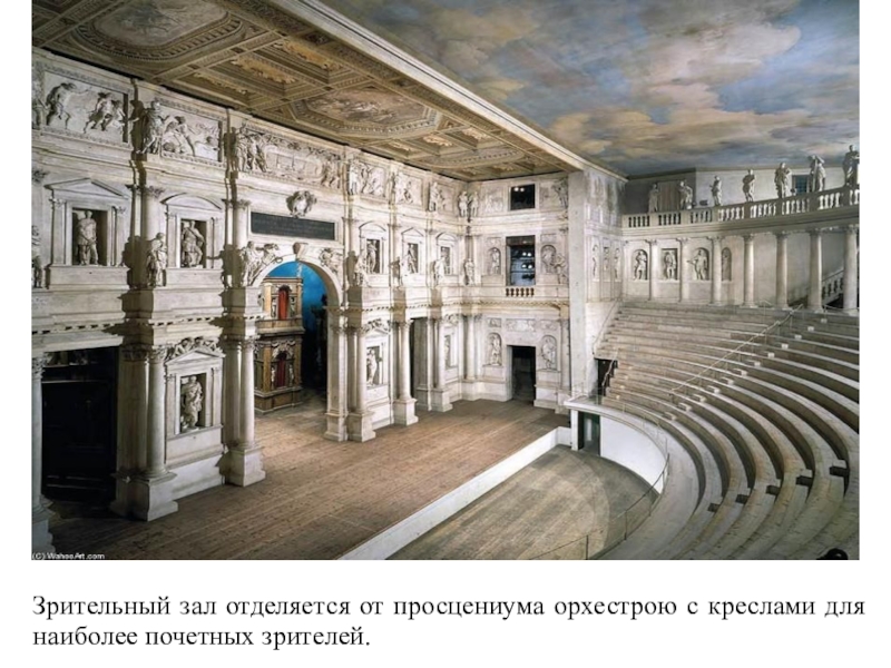 Слайд 23Зрительный зал отделяется от просцениума орхестрою с креслами для наиболее почетных