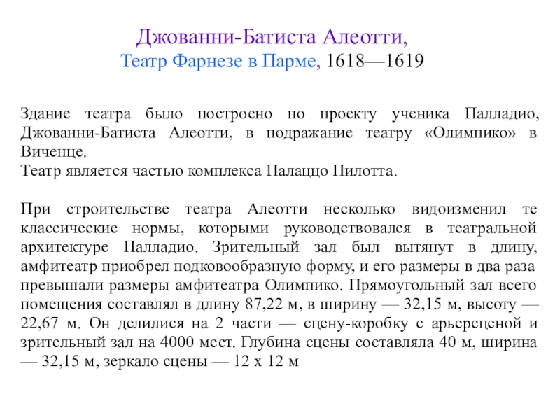 Слайд 29Здание театра было построено по проекту ученика Палладио, Джованни-Батиста Алеотти, в