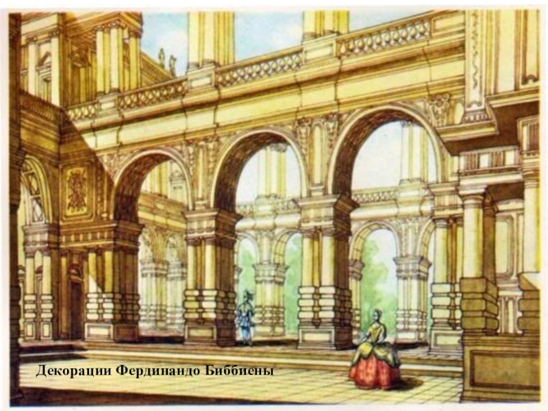 В эпоху, когда протекала театральная деятельность семейства Биббиены, для усиления эмоционального воздействия широко использовались игра светотени, разнообразие в изображении архитектурных сооружений, арок, колоннад, анфилад зал в стиле барокко с повторяющимися рядами колонн. Создавалось впечатление грандиозности, бесконечной перспективы.