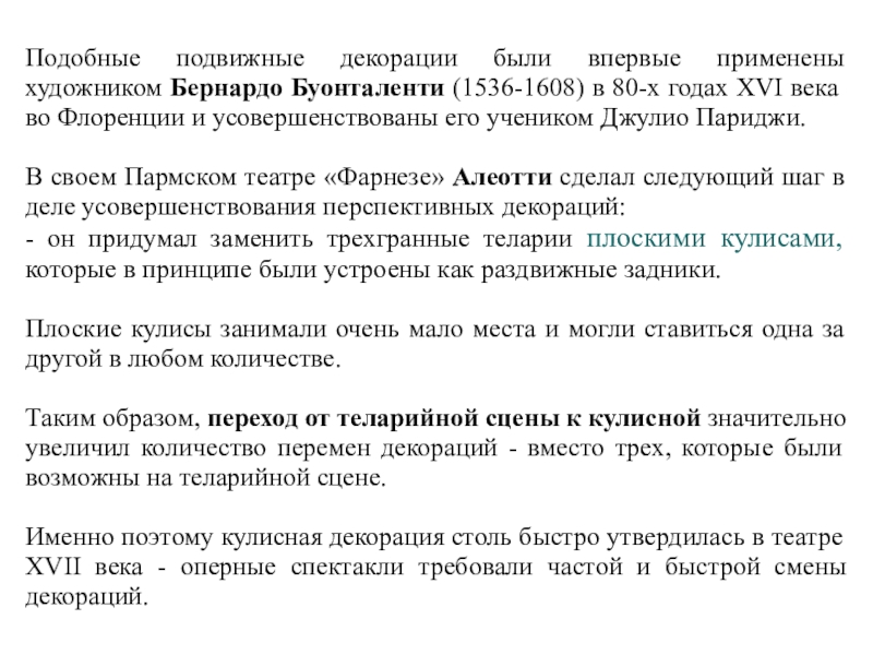Слайд 43Подобные подвижные декорации были впервые применены художником Бернардо Буонталенти (1536-1608) в
