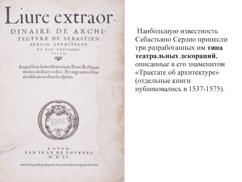 декораций, описанные в его знаменитом «Трактате об архитектуре» (отдельные книги публиковались в 1537-1575).