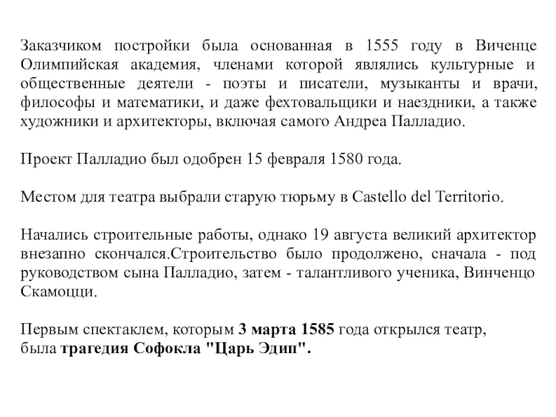 Слайд 18Заказчиком постройки была основанная в 1555 году в Виченце Олимпийская академия,