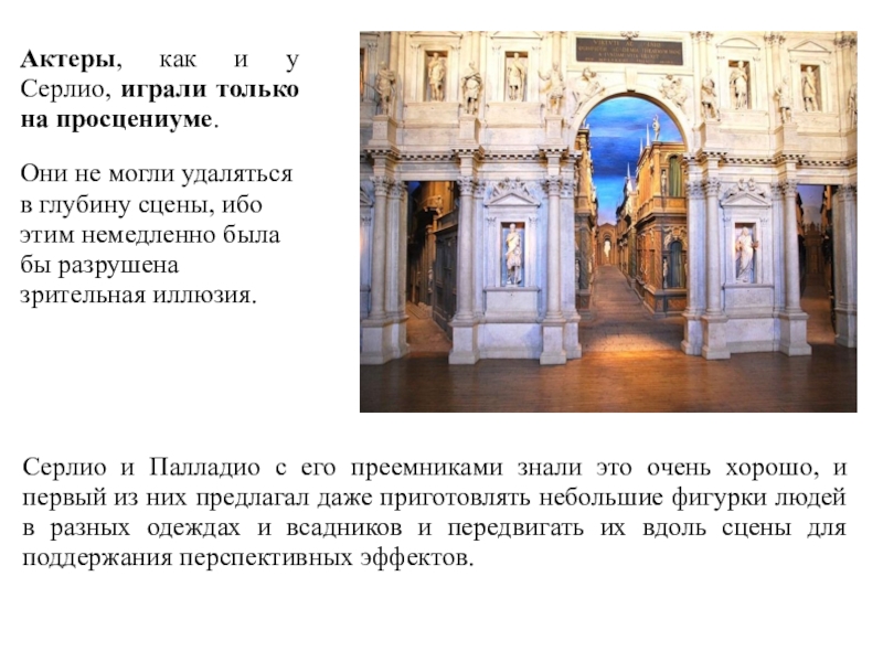 Серлио и Палладио с его преемниками знали это очень хорошо, и первый из них предлагал даже приготовлять небольшие фигурки людей в разных одеждах и всадников и передвигать их вдоль сцены для поддержания перспективных эффектов.
