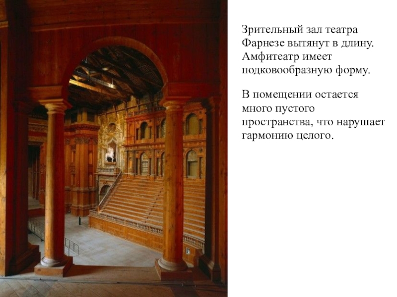 Слайд 37Зрительный зал театра Фарнезе вытянут в длину. Амфитеатр имеет подковообразную форму.