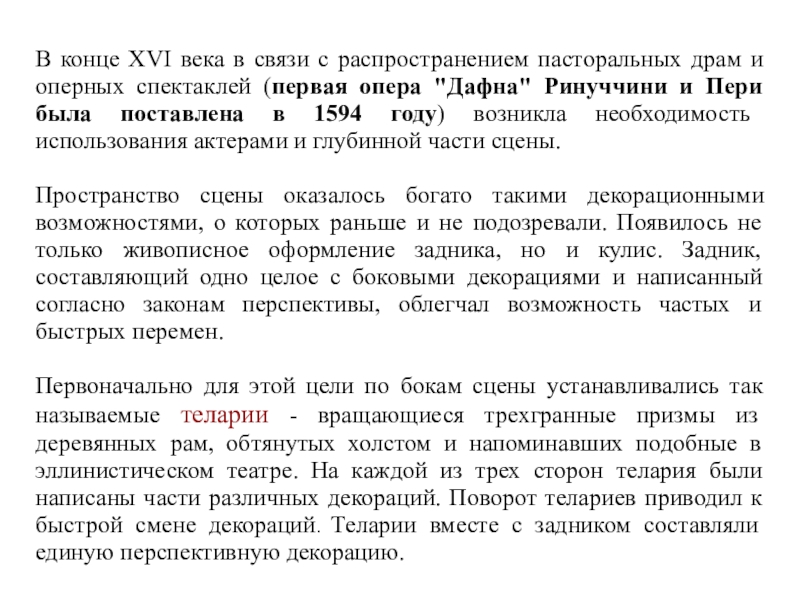 оперных спектаклей (первая опера "Дафна" Ринуччини и Пери была поставлена в 1594 году) возникла необходимость использования актерами и глубинной части сцены.