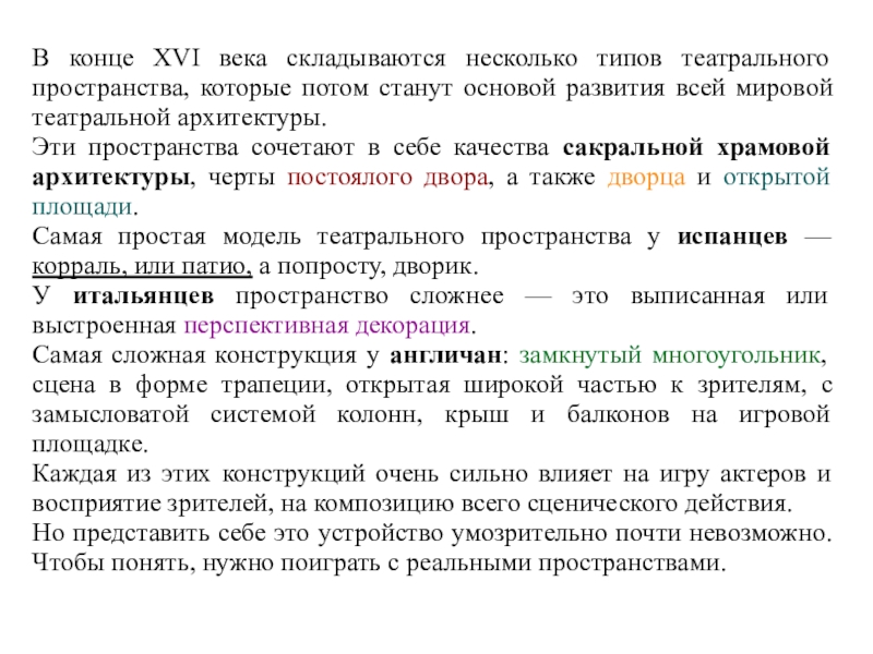 Слайд 2В конце XVI века складываются несколько типов театрального пространства, которые потом