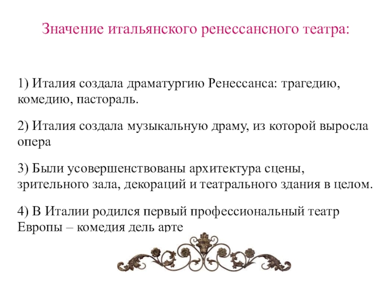 1) Италия создала драматургию Ренессанса: трагедию, комедию, пастораль.