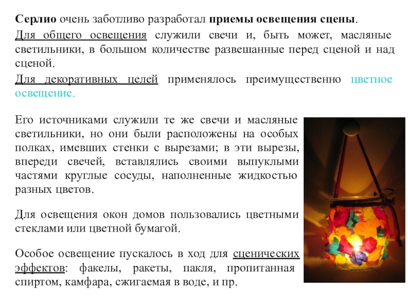 Слайд 12Серлио очень заботливо разработал приемы освещения сцены.